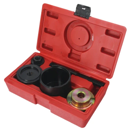 Zestaw narzędzi do montażu i demontażu tulei metalowo-gumowych. Może być używany na miejscu bez zdejmowania aluminiowej obudowy. Przy użyciu klucza 24 mm.